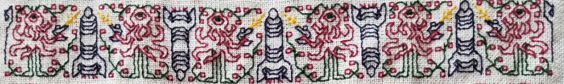 Bug eyed monsters waving ray guns in their tentacles! Mid-century era finned spaceships! Coming and going! Run! Hide! It’s an invasion, for sure and cheesy peril abounds. Or capture them for all time, frozen in your stitching. I recommend the latter. It’s far more relaxing to sit and embroider than it is to bolt away in terror.
