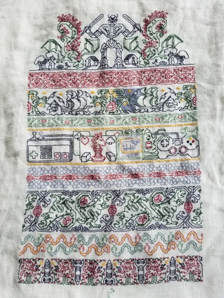 Here’s my own rendition of the thing, to date. This is just the first nine out of the total nineteen strips and some of those are partial. I went for polychrome because I rarely get a chance to do that. I’m using six colors, although you are seeing only five right now. There are light and dark shades of red, green, blue, and yellow. The light yellow will be used in the future for voiding and detail, but I haven’t stitched those parts in yet. You can also see partial voiding in the Pirates strip (#3). I will go back and finish that for the entire band, and eventually fill in the dice on the gaming band and add their pips, but I wanted to lay down as much of the rest of the piece as quickly as possible because I got a late start on it.