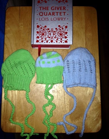 To cheer her up and warm those toes, I whipped up a quick set of tie-on toe socks. I used worsted weight washable acrylic or superwash wool blends, all leftovers from prior projects, and US #5 needles, playing with simple stranding, eyelet patterns, or no design at all, as whimsy manifested. I think that the pale blue is in fact left over from a Fishy Hat I knit for Veronica years ago…