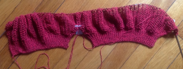 I’m also working on a two-person knit-along with Friend Kim – a mesh-knit three-quarter sleeve pullover from a Kate Bellando pattern. I think we’re both at about the same mid-sleeve point: