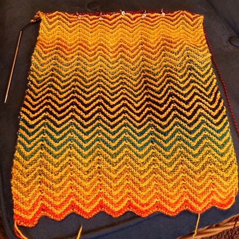 I used a free pattern on Ravelry, Christy Kamm’s ZickZack Scarf. I used 3.0mm needles (about a US 2.5), and did the recommended eight repeats of the 12-stitch garter stitch pattern. swapping the multicolor and mustard yarns every other row (each garter stripe). Every row was the same – as such it was the perfect totally mindless piece to work in the evenings, even while watching subtitled movies.