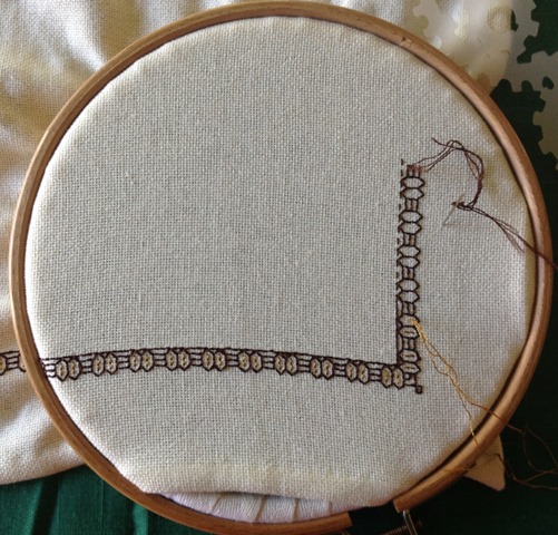 The narrow edging is yet another design from my forthcoming book, but worked in two colors. And I will be picking out the beginning of the filled gear underneath the letter “T.” Once I have the outer edging finished, I will trace the field using the stencil. Then I will stitch up the gears using fillings from Ensamplario Atlantio, with their edges defined crisply using either back stitch or chain stitch (experimentation will ensue).