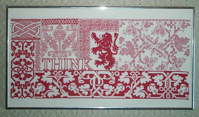 “Think.” Done for the husband in 1989. DMC on 32 count linen around 1989. The leafy log panel (in TNCM) looks familiar? Scroll up – it’s also on the wedding sampler, but there in multicolor.