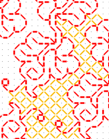And last, the width of the rightmost box on the current fill line. All of the ones in this row are supposed to be squares of 24 stitches. Except that one. There was only room for him to be 23 units wide. Now four boxes of 24 units plus three separators of two units each equals 102. But there he is, one stitch unit narrow. So it goes. I’ll pick a nice scattered fill with a half-drop repeat and no one will notice. Plus an added benefit of the strident, visually distracting alternating strips is that they break cadence. I can correct the count after the next one is done, and the correction will be difficult to see because of the solid red mass separating it from the fills above.