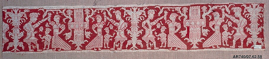 l. From the Cooper-Hewitt collection, Band. Italy, 16th–18th century; silk on linen; H x W: 24.1 x 172.1 cm (9 1/2 x 67 3/4 in.); Gift of Richard C. Greenleaf; 1954-167-5. These four panels show elements of the Adam and Eve story, and the workaday life after Eden . It’s done in red silk on linen, with a densely overworked meshy background. I don’t necessarily agree that it’s long armed cross stitch – that has a different look of directionality. This has more of a meshy appearance. Foregrounds are outlined (back stitch according to the listing), and ornamented by knot stitches.