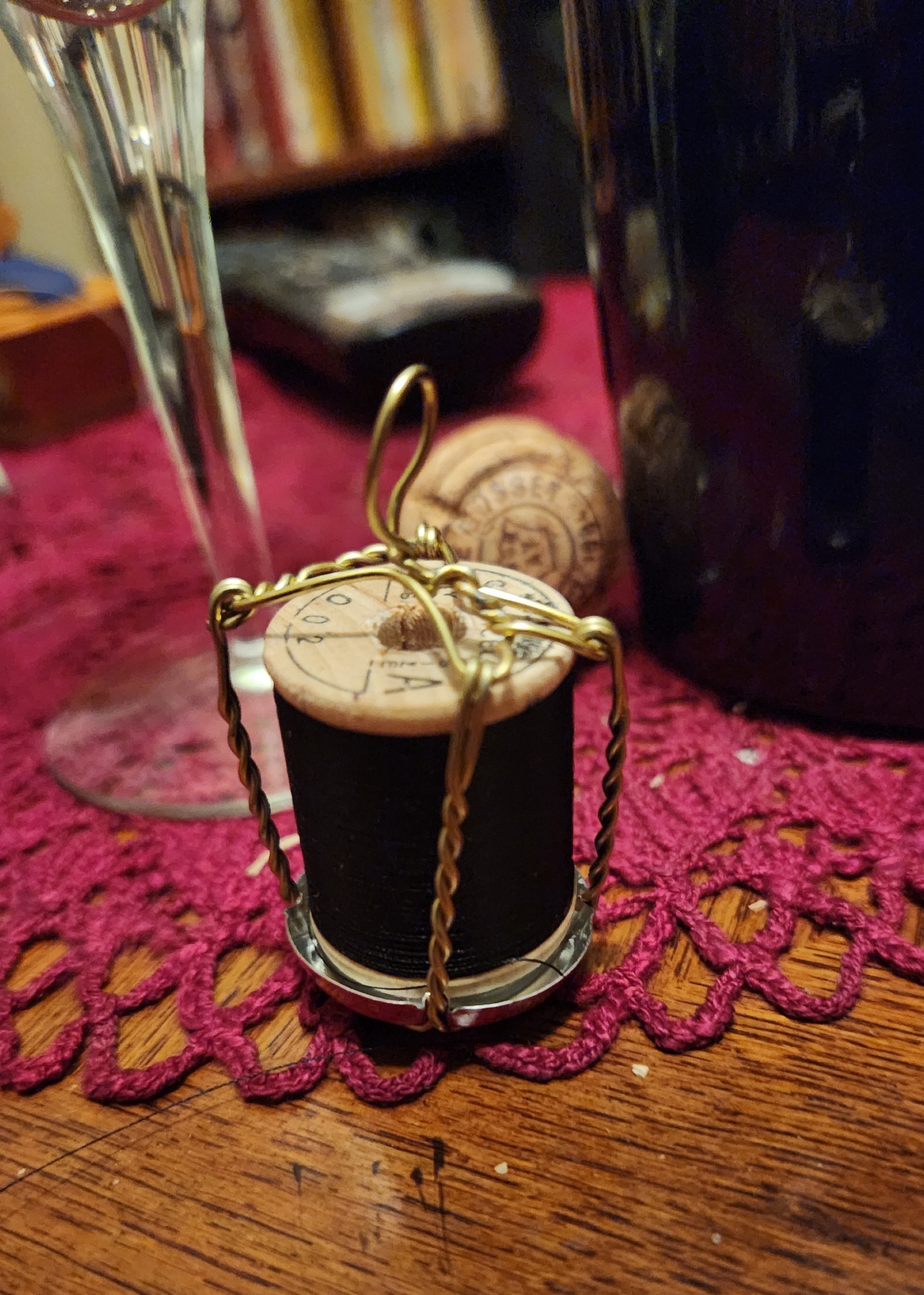 Oh. I did get a side benefit from the dissolute evening of sodden stitchery. I took the cork cage/bail from the bottle and twisted it into a spool holder for my chatelaine. I may go back and redo this with a silver tone one I had saved from last year’s bottle, but for now, it’s working well. The tiny spool of Corticelli Size A embroidery silk spins with little effort; just enough to make inadvertent unwinding unlikely, but easily enough to reel off what I need.