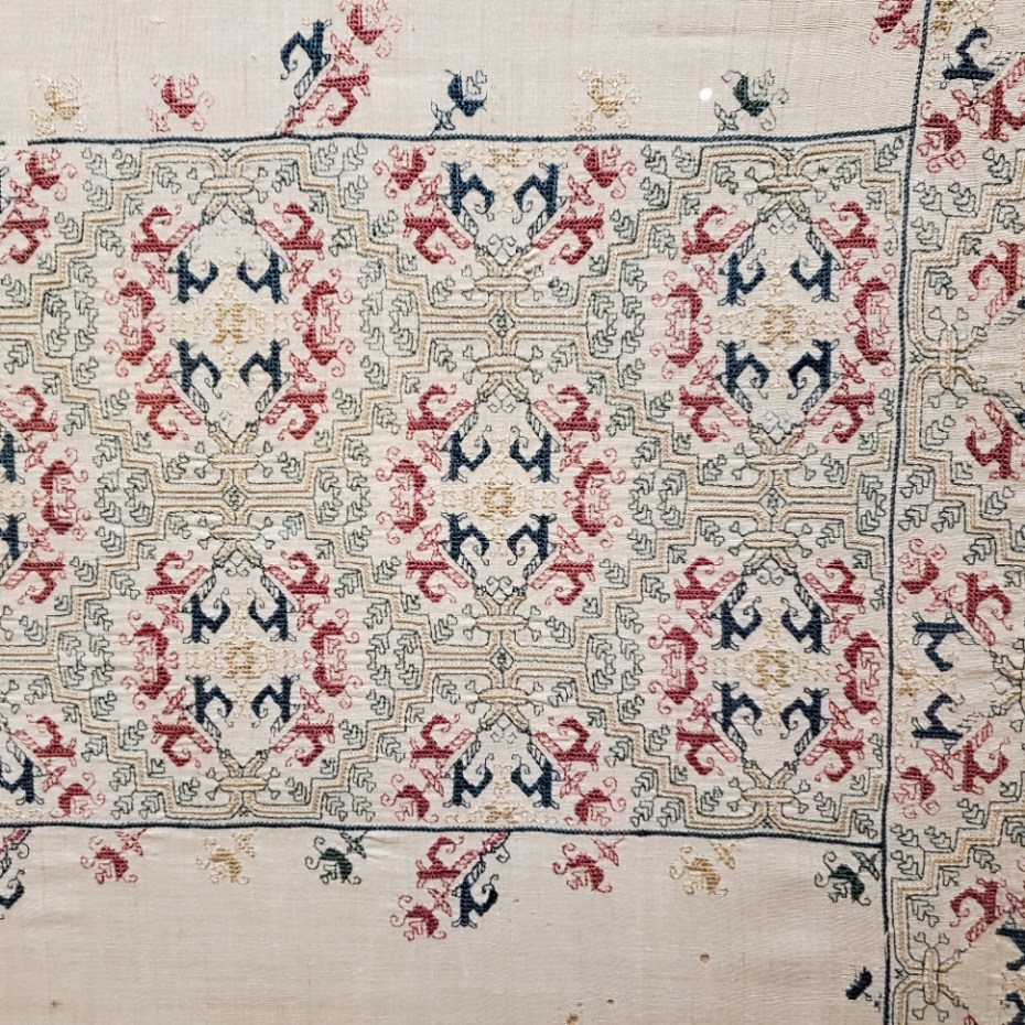 And after all this stitching is complete I will do a close-rolled hem, like the original. Possibly with the vertical ornamental elements in green also shown in the photo above. I haven’t decided on whether those are plain vertical stitches, buttonhole, or blanket stitches – the fragments are few and difficult to interpret from the museum photos and the ones I took at the 2023 MFA exhibit. In any case they are clearly decorative and not structural because there are very few hits of them scattered around the edges, and the hem is sewn and intact even where they are absent. The last step will be cheeky little red tassels on the corners.