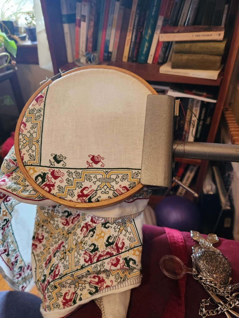 If it looks to you like I’ve sped up production – I have. I had wanted to mount this piece on my big Millennium frame, but I had no extra wide twill tape on hand. In person shopping being a bit unwieldy right now and not wanting to rely on goods sight-unseen I’ve stuck with the hand hoop, the sit-upon hoop being an inch wider across and even less suited to close-edge work than this smaller one. But I decided to stick the little hoop into my Lowery floor stand. That lets me work two-handed, one above and one below. And working that way for me is about half again as speedy as holding the hoop in one hand and stitching with the other. So one “up” repeat including initial outlines, meshy fills, and Montenegrin lines took about an evening and a half to stitch using the floor stand, but took three+ evenings with the hoop in hand.